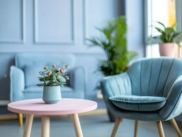 Living room with pink coffee table, blue armchair, light blue sofa, and potted plants.